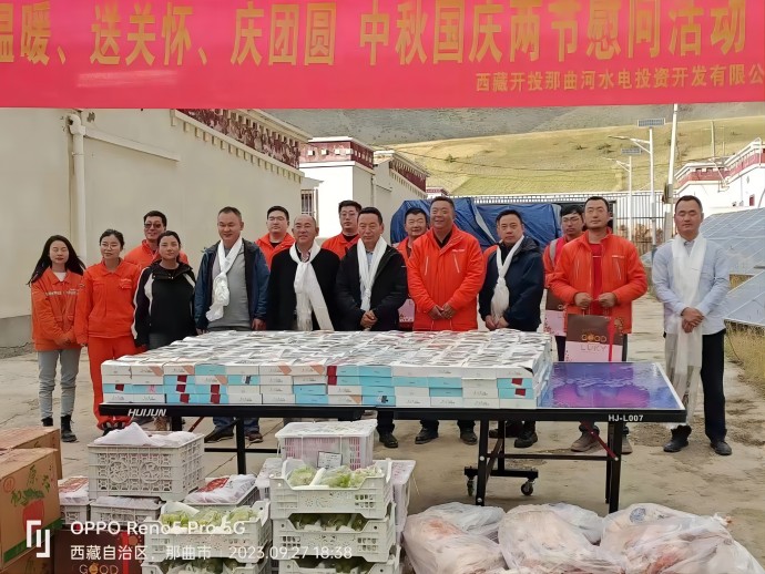 9月27日,西藏開投那曲河水電開發(fā)投資有限公司組織開展送溫暖、送關(guān)懷、慶團(tuán)圓中秋國(guó)慶兩節(jié)慰問(wèn)活動(dòng),集團(tuán)公司副總經(jīng)理尼瑪出席活動(dòng),那曲河公司總經(jīng)理何驍及其它相關(guān)人員參加。
