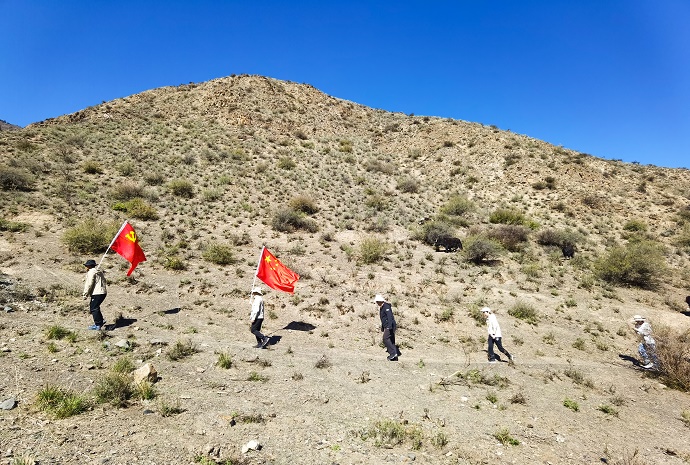 此次踏勘全程22公里,海拔垂直高度1200米。9時30分,新能源公司踏勘人員肩抗黨旗、國旗,背負測量設備和儀器從山腳沿項目進場道路出發(fā)。在徒步上山過程中,天氣炙烤灼人,大家三五隨群,或健步直沖或駐足而立,或仔細測量或落筆記錄,或討論工作或抒懷暢想。大家互相幫助、互相鼓勁,隨著海拔的不斷攀升,身體負重不斷加大,氣息開始急促、腳步不再有力,每前進一步都特別的困難,但眼前的大山壯闊雄渾,遠處的冰川雪景圣潔空靈,頭頂?shù)奶炜照克{纖塵不染,讓大家心曠神怡,真切感受到高度是一種境界,攀登是一種追求,是一種“小天下”的胸懷和氣魄!