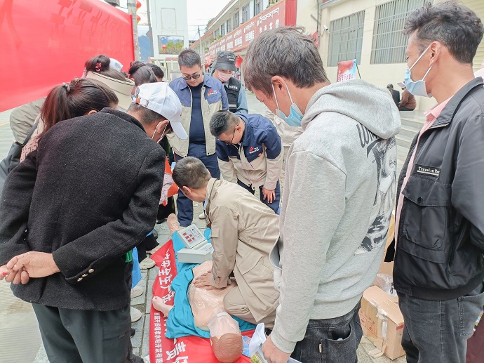 為保證活動實(shí)效,嘎堆水電公司提前籌劃、精心準(zhǔn)備了形式多樣的活動素材,現(xiàn)場不僅懸掛了“實(shí)施安全生產(chǎn)法 人人事事保安全”的宣傳標(biāo)語,還設(shè)置了咨詢臺、安全展板等,志愿者們向現(xiàn)場群眾講解并發(fā)放了《安全生產(chǎn)月宣傳雨傘、文化帽》《安全知識進(jìn)萬家系列—急救知識宣傳冊》等四類共計(jì)150份安全生產(chǎn)政策法規(guī)、應(yīng)急避險和自救互救方法等方面的宣傳資料。在實(shí)操展示環(huán)節(jié),志愿者用心肺復(fù)蘇模擬器和觸電感受器向現(xiàn)場群眾講解并演示了急救知識—心肺復(fù)蘇操作方法和體驗(yàn)人體觸電的真實(shí)感受。