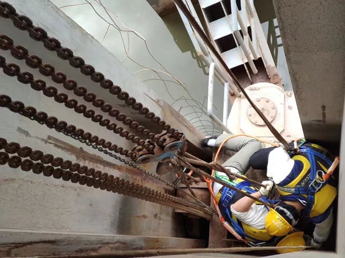 9月5日11時30分,果多水電站上游來水量突增,水庫攔污漂變浮箱無法及時上浮,導(dǎo)致大量垃圾飄進(jìn)進(jìn)水口區(qū)域,給機(jī)組運(yùn)行造成一定的安全隱患。吉克爾博接到部門安排后,馬上帶領(lǐng)兩名青年員工到浮箱上利用千斤頂、手動葫蘆等工具開展處理。經(jīng)過分析、討論,判定攔污漂卡澀的原因為導(dǎo)向輪長期受力不均發(fā)生變形,利用千斤頂反向作用力和手拉葫蘆的牽引力,最終將攔污漂卡澀問題解決。