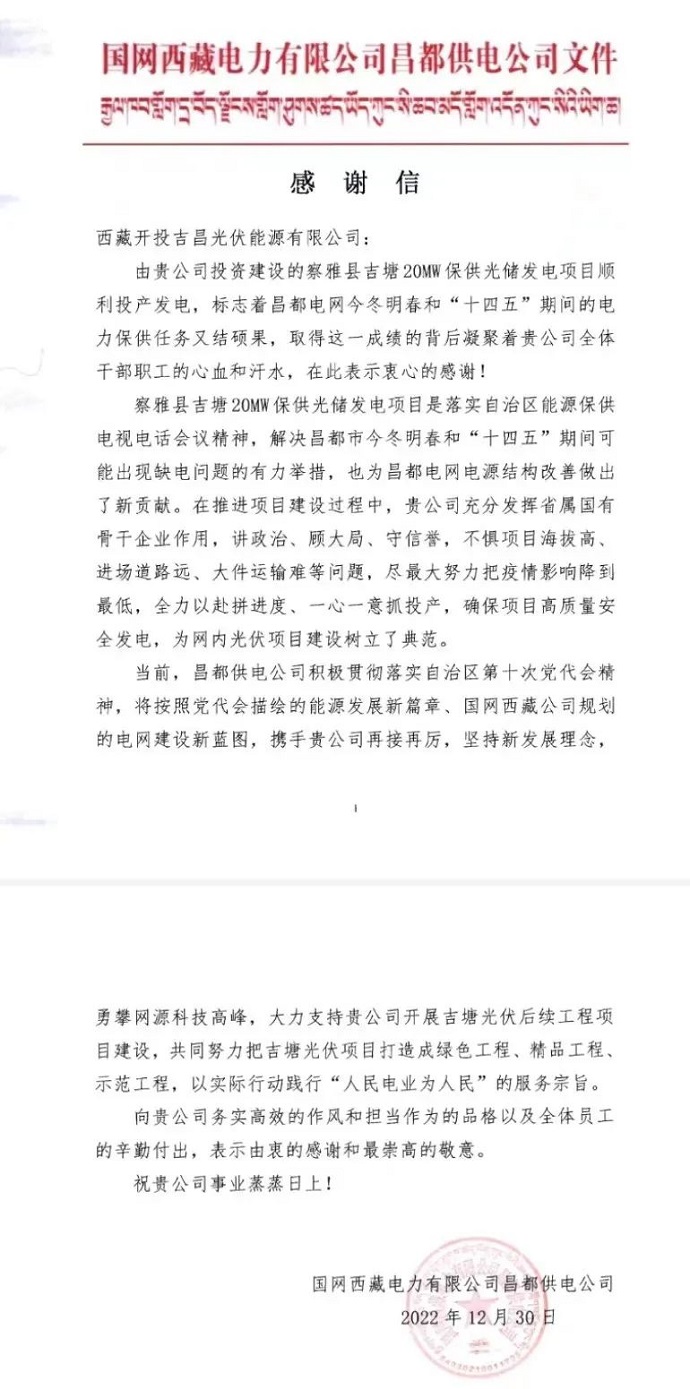 國網(wǎng)西藏電力有限公司昌都供電公司向吉昌光伏公司發(fā)來感謝信