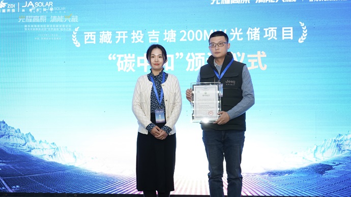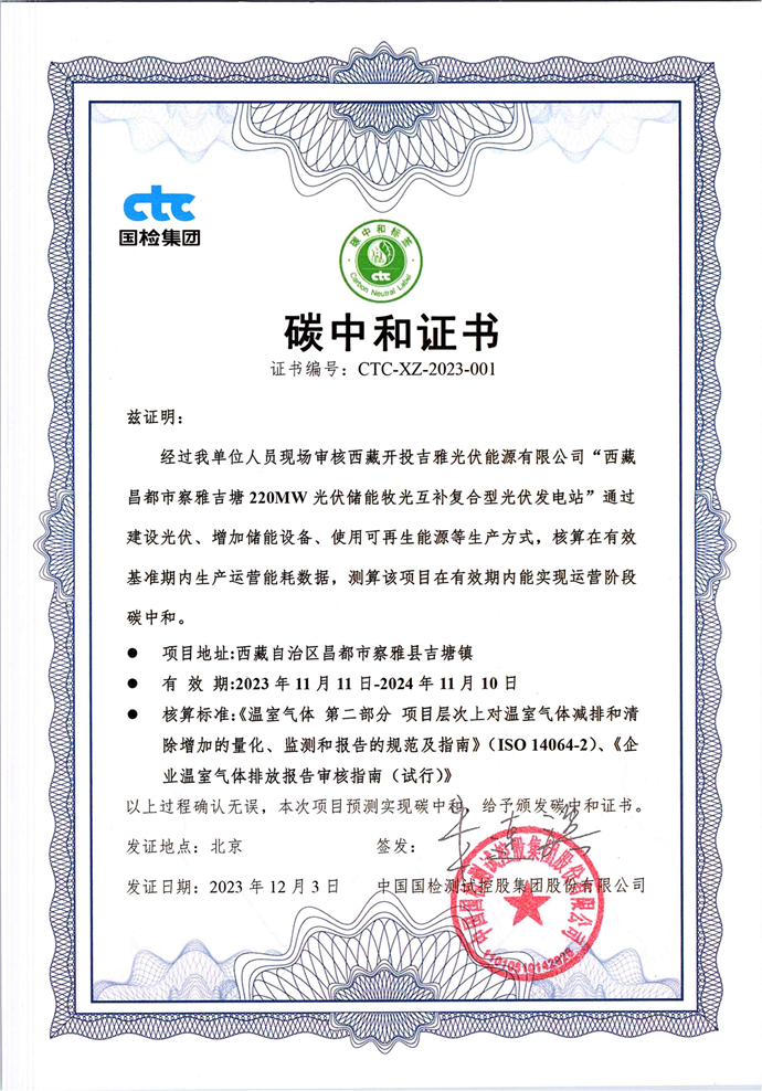CTC國檢為吉塘200MW項(xiàng)目頒發(fā) “碳中和”證書