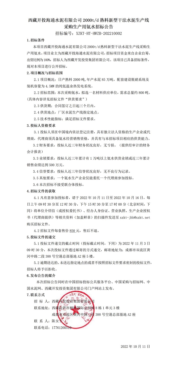 采購生產(chǎn)用氨水招標公告