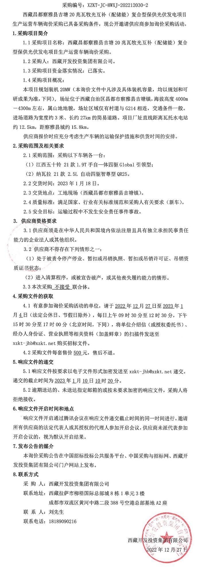 西藏昌都察雅縣吉塘20兆瓦牧光互補(bǔ)(配儲(chǔ)能)復(fù)合型保供光伏發(fā)電項(xiàng)目生產(chǎn)運(yùn)營(yíng)車(chē)輛詢(xún)價(jià)采購(gòu)二次公告