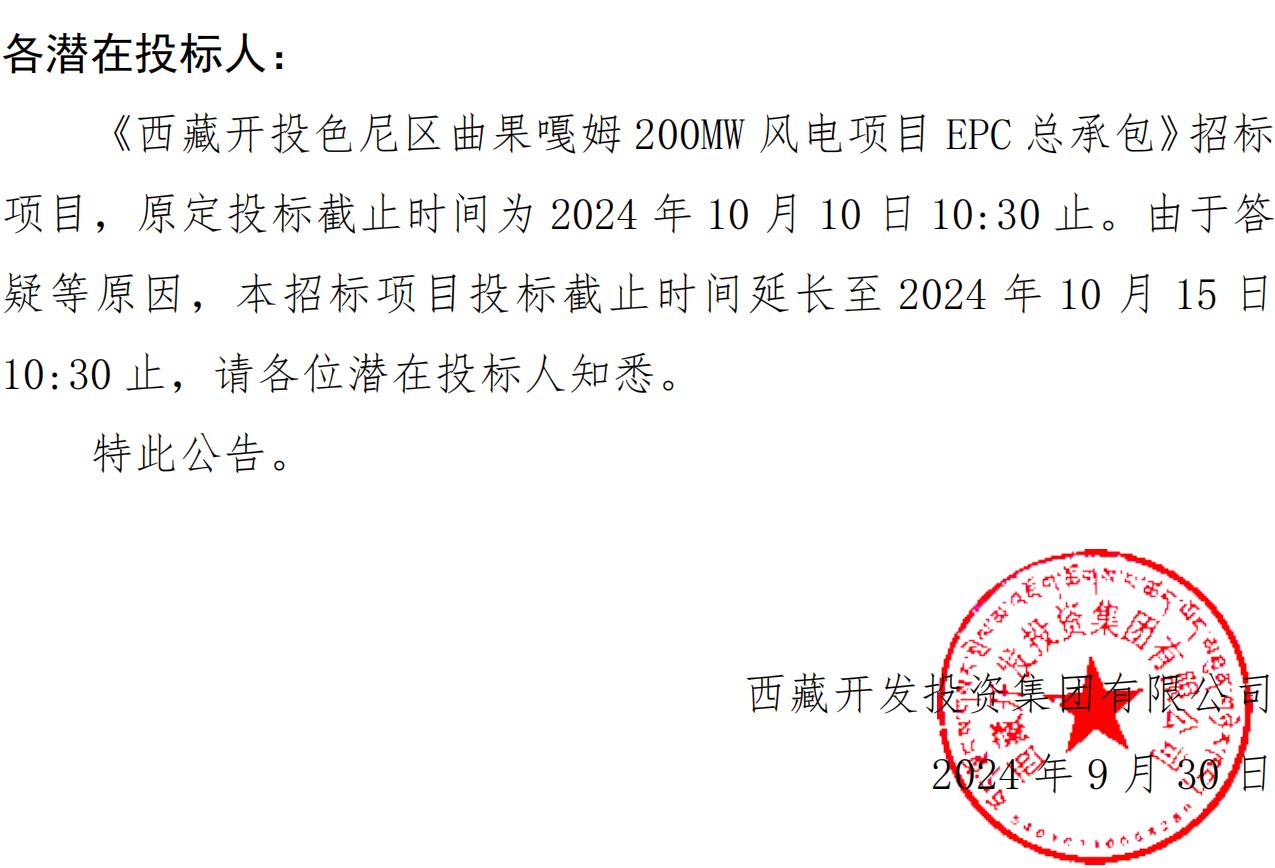 關(guān)于延長《西藏開投色尼區(qū)曲果嘎姆200MW風(fēng)電項(xiàng)目EPC總承包》投標(biāo)截止時間的公告